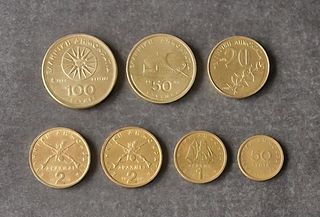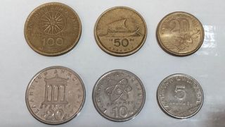 Lotto composto da 6 monete greche in Dracme. - 100 Dracme, 1992 - 50 Dracme, 1986 - 20 Dracme, 1986 - 20 Dracme, 1988 - 10 Dracme, 1986 - 5 Dracme, 1992