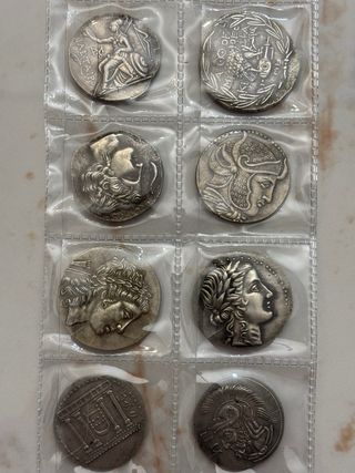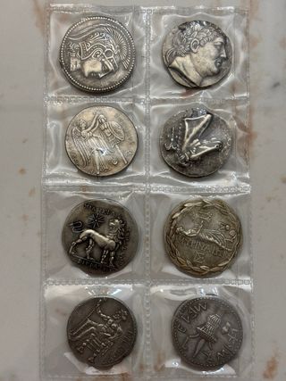 Set di 8 monete antiche provenienti dalla Grecia, ognuna con un design distintivo! RIPRODUZIONI OJO!! - Moneda con elmo corinzio. - Moneda con profilo di Alessandro Magno. - Moneda con figura alata. - monete con testa di cavallo - monete con leone e stella - Moneda con figura seduta. - Moneda con la figura di un guerriero. - Moneda con struttura architettonica.