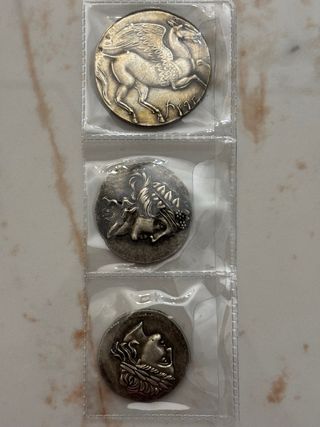 Set di tre monete in stile greco antico!! RIPRODUZIONI OJO!! Ogni moneta presenta un design unico. - Disegno del Pegaso alato su una moneta. - Figura di guerriero con uno scudo su un altro. - Profilo della testa umana sulla terza moneta.