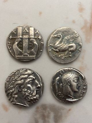 Set di quattro monete antiche provenienti dalla Grecia!! RIPRODUZIONI OJO!! - Design Pegasus. - Testa d'uomo con corona d'alloro. - Figura femminile. - Simboli greci.