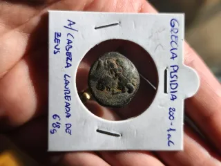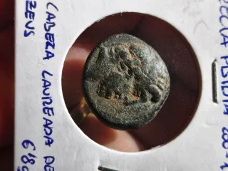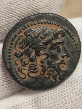 Antiche monete di origine greca. Presenta un design dettagliato in rilievo. - Materiale: bronzo - Design: viso con corona d'alloro e capelli ricci di Zeus. - 10,68 g. 25 mm