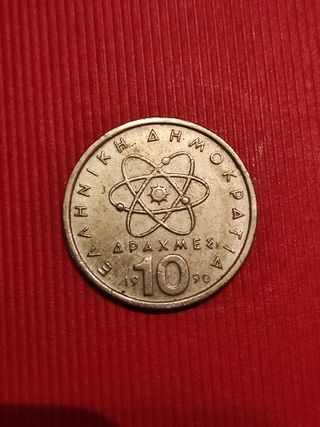 Moneda greca da 10 dracme, già fuori circolazione, con ritratto. Coniato nel '76 Questa particolare moneta è stata coniata dopo la fine della dittatura militare e l'inizio della Terza Repubblica Ellenica nel 1974. - Iscrizione greca antica.