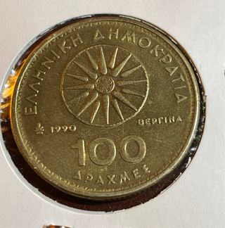 Moneta da 100 Dracme greche coniata nel 1990. - Dettaglio del busto di Alessandro Magno sul dritto. - Scritta ΒΑΣΙΛΕΥΣ ΜΕΓΑΣ ΑΛΕΞΑΝΔΡΟΣ sul rovescio.