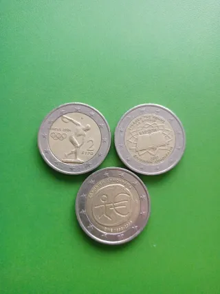 Set di tre monete da 2 euro della Grecia. - Una moneta commemorativa dei Giochi Olimpici di Atene 2004. - Una moneta commemorativa dell'Unione Economica e Monetaria del 2007. - Una moneta commemorativa dell'introduzione dell'euro dal 1999 al 2009.