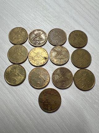 Lotteria di 13 monete da 2 dracme della Grecia moderna. Ogni moneta presenta un design distintivo. - Monete da 2 dracme greche. - Design con armi incrociate e spiga. - Anni variabili visibili sulle monete.