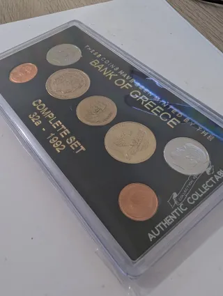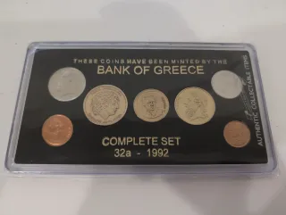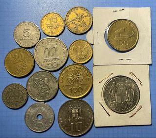 Set di monete greche in Dracma. Include monete da 5, 10, 20, 50 e 100 Dracme. Disegni vari con motivi storici e culturali della Grecia. Alcune monete risalgono al 1984.