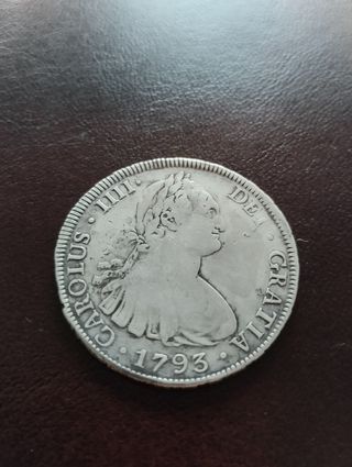 Moneta da 8 Reales coniata a Potosí nel 1793, con l'effigie di Carlos IIII. - Canto con greche. - Design dettagliato del busto. - Iscrizione CAROLUS IIII DEI GRATIA.