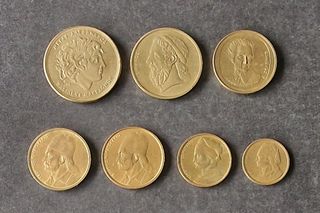 Serie di sette monete greche, dracme. - Monete con effigi storiche. - Diverse dimensioni e metalli.