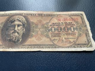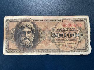 Viene inviato il biglietto dell'immagine, sono 500.000 dracme greche. L'occupazione greca da parte dei nazisti (forze dell'Asse) dura dal 1941 al 1944. Durante questo periodo, in particolare la grande carestia dell'inverno 1941-42, morirono più di 300.000 persone a causa delle privazioni causate dalla guerra e dalla fame. L'economia greca, già indebolita, crollò, lasciando il paese in rovina e con una forte inflazione. Questo biglietto visse durante quel periodo di incertezza. - Banca: ΤΡΑΠΕΖΑ ΤΗΣ ΕΛΛΑΔΟΣ (Banca di Grecia). - Data di emissione: 20 marzo 1944.