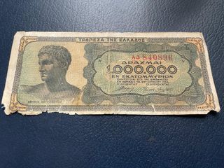 Viene inviato il biglietto dell'immagine, è 1 milione di dracme greche. L'occupazione greca da parte dei nazisti (forze dell'Asse) dura dal 1941 al 1944. Durante questo periodo, in particolare la grande carestia dell'inverno 1941-42, morirono più di 300.000 persone a causa delle difficoltà causate dalla guerra e dalla fame. L'economia greca, già indebolita, crollò, lasciando il paese in rovina e con una forte inflazione. Questo biglietto visse durante quel periodo di incertezza. Data di emissione: 29 giugno 1944. Rappresenta l'Efebo di Anticitera.