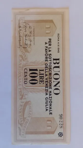 Buono per la sottoscrizione nazionale a favore della Venezia Giulia. - Valore: 100 Lire - Data: 4 Novembre 1945 - Luogo: Roma - Serie: 90228