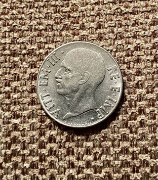 Moneta da 20 centesimi di Lire del Regno d'Italia, coniata nel 1941. Dritto: La moneta presenta un profilo dignitoso del re Vittorio Emanuele III, un monarca che ha svolto un ruolo cruciale nella storia d'Italia all'inizio del XX secolo. Rovescio: Un'allegorica figura femminile che simboleggia l'Italia abbellisce la moneta, il cui volto è accompagnato dai fasci emblematici - un simbolo di autorità dell'antica Roma. - Zecca: Roma (R).