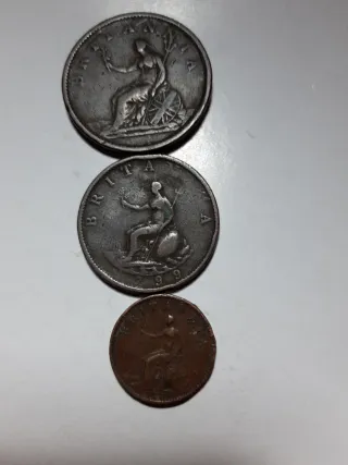Set di tre antiche monete della Gran Bretagna. 1 Farthing 1807. Half Penny 1799. Penny 1806. Rame - Monete con il busto di Giorgio III. - Iscrizioni in latino. - Una moneta con l'anno 1807.