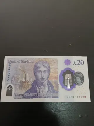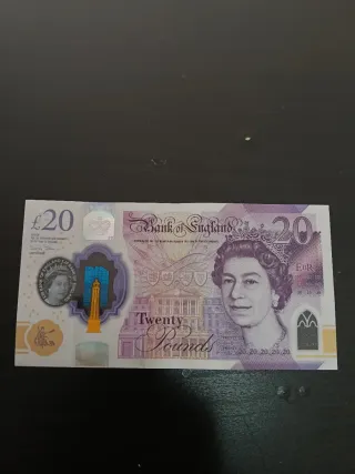 Banknota da 20 sterline inglesi emessa dalla Banca d'Inghilterra. Mostra il ritratto della Regina Elisabetta II e l'edificio della Banca d'Inghilterra. - Valore: 20 sterline inglesi. - Emettitore: Banca d'Inghilterra. - Design: Ritratto della Regina Elisabetta II. - Serie: Serie G (polimerica).