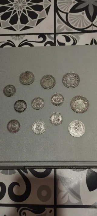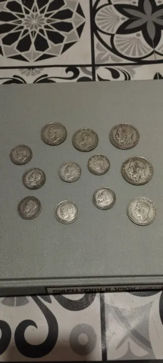 -Set di monete britanniche tra gli anni '20 e '40 con effigi dei re inglesi Giorgio V e Giorgio VI. Del periodo tra le due guerre e la II Guerra mondiale. - 100 grammi di monete con una purezza di 0,500 (50% argento) non di 0,925 come nelle decadi precedenti a causa della pressione economica dopo la prima guerra mondiale. - Il loro valore di vendita attualmente corrisponde solo al valore dell'argento per grammo, un'occasione. Un'acquisizione perfetta per conoscere una fase storica o per il suo mero valore in metallo.