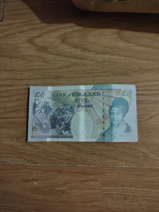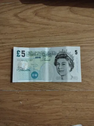 Banknota da 5 sterline inglesi del Banco d'Inghilterra. Serie KC36147037. Con ritratto della Regina Elisabetta II.