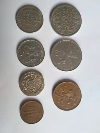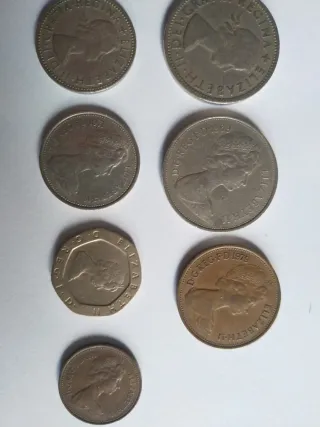 Set di 7 monete inglesi da collezione. - 1x 50 new pence (1969) - 1x 2 new pence (1980) - 1x 2 two pence (1987) - 1x one shilling Giorgio VI (1949) - 3x one pound (1983, 1983, 1991)