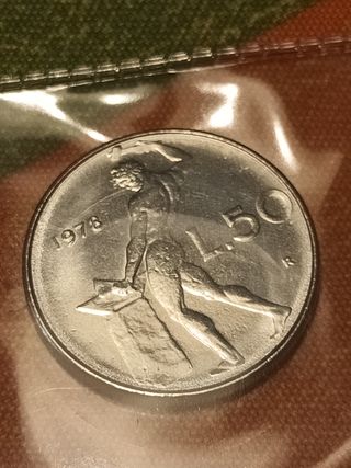 Moneta da 50 Lire del 1978. - Diritto: Figura di un uomo che lavora. - Rovescio: Valore nominale 50 e anno 1978.