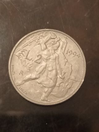 Moneta da 2 Lire del 1994 in condizioni FDC (Fior di Conio). - Dritto: Ritratto di una figura femminile. - Rovescio: Indicazione del valore L.2 e anno 1994. - Zecca: Roma.
