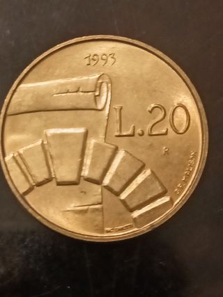 Moneta da 20 Lire del 1993. - Dritto: Ritratto di una donna con corona di alloro. - Rovescio: Ruota dentata con un fascio di spighe. - Anno: 1993. - Valore: 20 Lire.