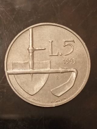 Moneta da 5 Lire di San Marino del 1993. - Dritto: Spiga e zappa. - Rovescio: Scudo di San Marino. - Zecca: Roma. - Anno: 1993.