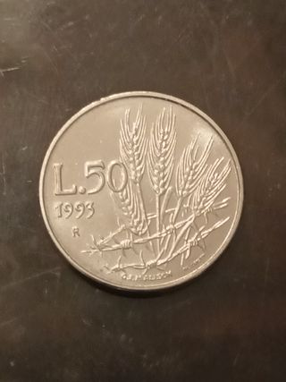 Moneta da 50 Lire della Repubblica di San Marino, anno 1993. - Dritto: Ritratto di Bartolomeo Borghesi. - Rovescio: Spighe di grano e filo spinato. - Zecca: Roma. - Finitura: Fior di conio (FDC).