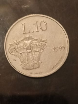 Moneta da 10 Lire di San Marino del 1993, con il motivo del capitello. - Emissione FDC (Fior di Conio). - Dritto: Capitello. - Rovescio: Scritta 10 LIRE e anno 1993.