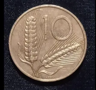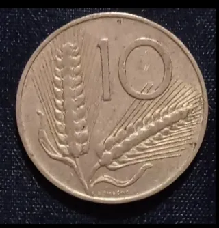 Moneta da 10 Lire del 1978. - Dritto: Spighe di grano. - Rovescio: Fascio littorio. - Zecca: Roma. - Incisore: Romagnoli.