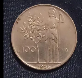 Moneta da 100 Lire italiane del 1956. - Raffigurazione di una donna con ramo d'ulivo. - Valore nominale 100 Lire. - Anno di conio 1956. - Presente la lettera R (zecca di Roma).