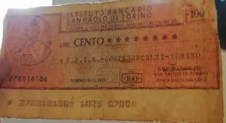 Banconota da 100 Lire emessa dall'Istituto Bancario San Paolo di Torino. - Valore: 100 Lire - Istituto: Bancario San Paolo di Torino - Presente timbro GIRATE F.I.T.B.