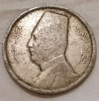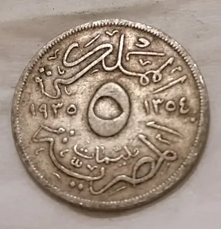 Moneta antica da 5 Lire dell'Egitto, coniata nel 1930. - Valore nominale: 5 Lire. - Anno di conio: 1930 (corrispondente all'anno islamico 1354). - Materiale: metallo. - Dritto: raffigurazione di un numero 5 al centro, con iscrizioni in arabo e numeri. - Rovescio: iscrizioni in arabo.