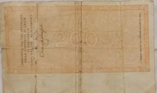 Assegno circolare della Banca del Salento del valore di 200 Lire. - Emesso a Lecce il 1-4-1977. - Numero di assegno: 001084562. - Valore nominale: Lire Duecento (L.200). - Consorzio fra gli Artigiani della Provincia di Lecce.