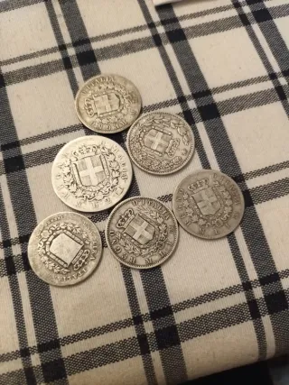 Lotto composto da sei monete antiche in argento. da 1 e 2 lire - Monete con stemma sabaudo. - Dettagli incisi visibili.