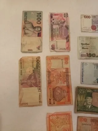 Lotto di banconote di diverse provenienze e tagli. - Banconota da 1000 Rupie Indonesiane. - Banconota da 5000 Rupie Indonesiane. - Banconota da 20 Rupie. - Banconota da 100 Rupie. - Banconota da 100 Lire Italiane. - Banconota da 25 Ringgit Malese.