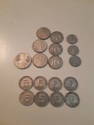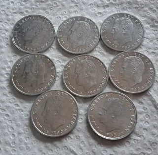 Vendo lotto di 25 monete antiche spagnole in buono stato di conservazione. Il lotto include: Época di Franco: - 3 monete da 2,50 Peseta (1953): Le più rare della collezione. - 2 monete da 5 Peseta (1957). - 1 moneta da 1 Peseta (1966). Reinado di Juan Carlos I: - 9 monete da 5 Peseta: Con varianti come quelle del Mundial 82 e Barcelona 92. - 8 monete da 1 Peseta: Anni vari, fino a quelle in alluminio piccole. - 2 monete da 50 Centimos (1980). Circolate ma con buona visibilità di rilievi e date. NON EFFETTUO SPEDIZIONI SU WALLAPOP. PAGAMENTO ANTICIPATO CON BIZUM O PAYPAL, CHE INCLUDONO LE SPESE DI SPEDIZIONE CON POSTA RACCOMANDATA