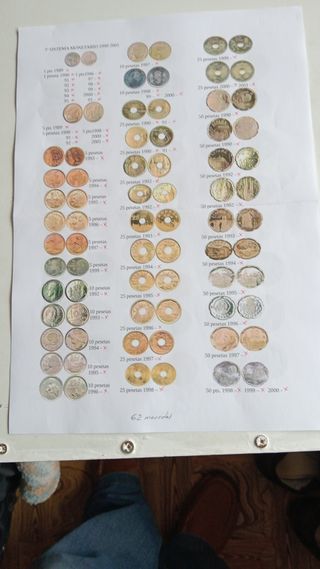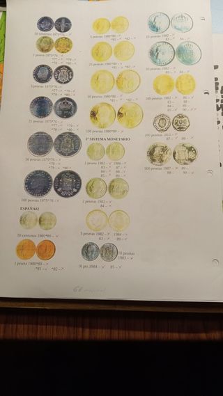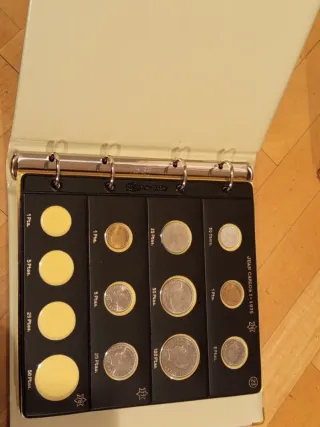 Due album con 178 monete diverse dell'epoca di Juan Carlos, incluse le monete da 2000 pts. Collezione quasi completa, tranne quelle mancanti da 500 pts degli anni 1988-89-2001 - da 100 pts 1983-84-88-89 e le due rare o errate da 5 pts del mondiale del 1980 e da 25 pts di Castiglia e León. In regalo 2 portafogli da 1975*77 - 1975*79 e 1980*80 del mondiale 82