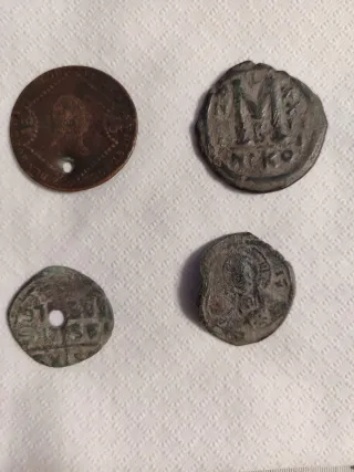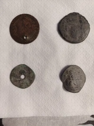 Set di quattro monete antiche. - Moneta di rame con foro centrale. - Moneta di metallo grigio con iscrizioni. - Moneta di bronzo con foro. - Moneta di metallo in rilievo.