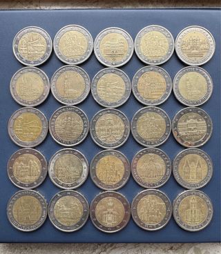 Vendo lotto esclusivo di 25 monete da 2 Euro commemorative tedesche (Cattedrali/Land). Il vero valore del set è la presenza di ben 10 esemplari della rara Zecca F (Stoccarda), ricercata dai collezionisti per la bassa tiratura. Dettagli Lotto: • 10 Monete Zecca F: Incluse varianti rare come Bundesrat 2019 e serie Cattedrali. • 15 Monete miste: Ottimo stato di conservazione. • Una moneta Zecca F presenta patina naturale (vedi foto). 💰Prezzo per il blocco: 69€. Perfetto per chi vuole completare la collezione in un colpo solo. 🚀 Spedizione rapida! ⏳ Set unico da 25 pezzi: ultime 10 monete Zecca F disponibili, non ne avrò altre.