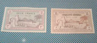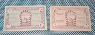 Lotto di due banconote della Tunisia del 1943, rare. Include una banconota da 2 Franchi e un'altra da 50 Centesimi. - Banconote della Reggenza di Tunisia. - Design con paesaggio e figure. - Protectorat Français.