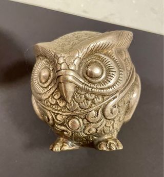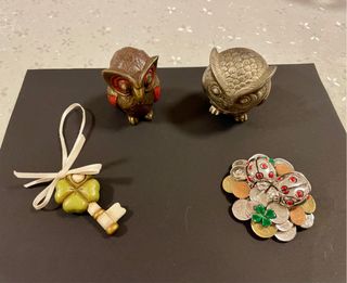 Set di gufetti decorativi e oggetti portafortuna. - Due gufetti in metallo - Portachiavi in ceramica a forma di quadrifoglio da appendere. - Composizione di monete con coccinelle e quadrifoglio in vero argento In regalo piattino in vetro smaltato