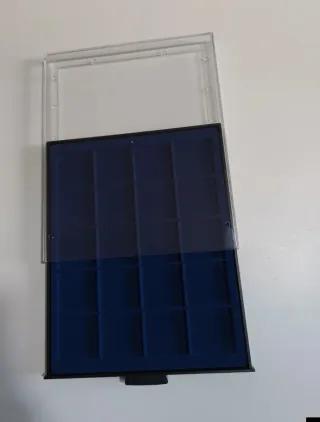 Cassetto porta monete o medaglie con 45 scomparti individuali. - Scomparti varie misure - Rivestimento interno blu. - Struttura in plastica nera. - Coperchio trasparente.