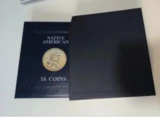 Raccoglitore per monete da 1 dollaro americano, serie Native American. - Copertina rigida blu. - Dettagli in rilievo sulla copertina. - Illustrazione di una moneta da 1$ con profilo nativo americano.