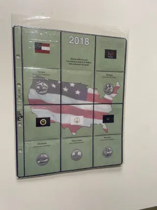 Foglio per la collezione di monete quarto di dollaro della Zecca di San Francisco, anno 2018. - Include monete degli stati di Georgia, Michigan, Minnesota, Rhode Island e Wisconsin. - Ogni moneta è accompagnata dalla bandiera dello stato corrispondente e dal nome della zecca. - Il foglio presenta una mappa degli Stati Uniti con le bandiere sovrapposte. Ovviamente senza monete!