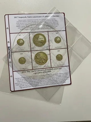 Foglio per la conservazione di monete commemorative. - Dedicato a Sequoyah, inventore del sillabario Cherokee. - Include monete del 2017 e 2018. - Dedicato a Jim Thorpe, giocatore di football americano e baseball. - Monete con disegni di Chris Costello, Charles L. Vickers e Michael Gaudioso. - Zecche di Denver e Philadelphia.