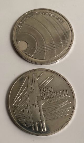Monete da 5 Franchi Svizzeri. 2 monete Franchi Svizzeri 5 franchi - 1985 Moneta Commemorativa Battaglia di Sempach - 1986 Moneta Confoederatio Helvatia