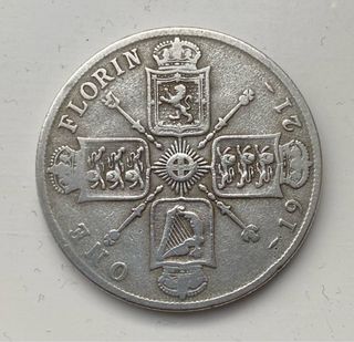 Moneta da 1 Fiorino del Regno Unito, coniata nel 1921 - Dritto: FLORIN e stemma. - Rovescio: ONE CROWN e stemma. Peso 13 gr Diametro 28