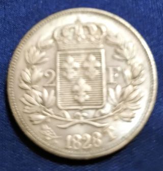 Moneta da 2 Franchi di Carlo X di Francia, coniata nel 1828. - Dritto: Corona reale, stemma con gigli e numero 2. - Rovescio: Corona reale, stemma con gigli, lettera F e anno 1828. - Zecca: T (Tours).
