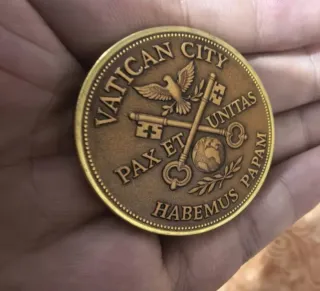 Moneta commemorativa del Vaticano con simboli religiosi. - Raffigurazione di colomba, chiavi incrociate e globo terrestre. - Scritta VATICAN CITY PAX ET UNITAS HABEMUS PAPAM.