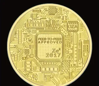 Moneta commemorativa Bitcoin, realizzata in acciaio placcato oro. Presenta un design ispirato alla tecnologia blockchain. - Materiale: Acciaio placcato oro. - Design: Ispirato alla tecnologia blockchain. - Dicitura: Vires in Numeris.