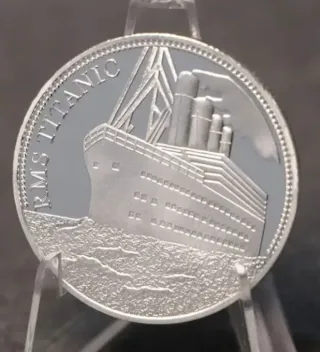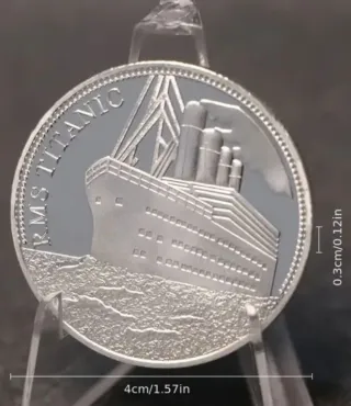 Moneta commemorativa raffigurante il transatlantico RMS Titanic. Dimensioni 4 cm di diametro x 1,57 cm di spessore Peso 24 grammi circa - Realizzata in Argento 925. - Dettagli incisi della nave e del mare.